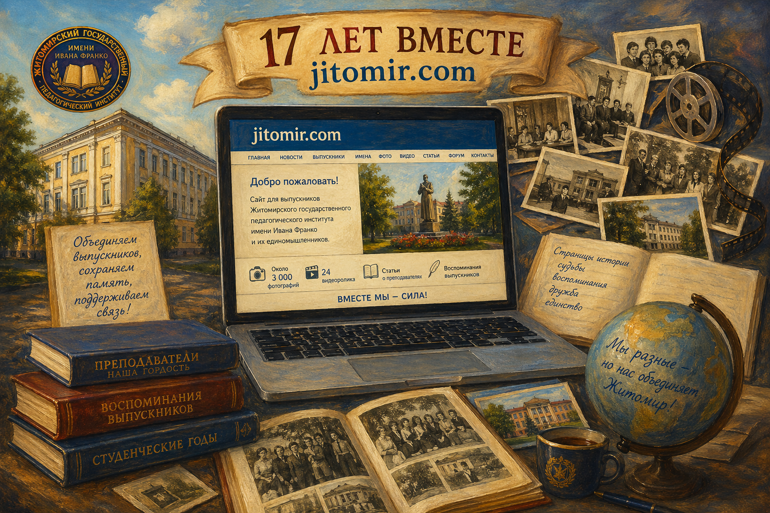 Сайт jitomir.com представляет собой уникальный интернет-проект, объединяющий выпускников Житомирского государственного педагогического института имени Ивана Франко (ныне университета) и их единомышленников, проживающих в разных странах, в том числе в Казахстане. Созданный в 2009 году как электронная база данных выпускников, за 17 лет своего существования он превратился в полноценную цифровую площадку памяти, общения и сохранения истории. Главная ценность сайта заключается в его объединяющей миссии. В условиях географической разобщённости бывших студентов, особенно тех, кто покинул Украину и живёт за рубежом, ресурс стал своеобразным «виртуальным домом». Здесь выпускники находят друг друга, делятся новостями, поддерживают дружеские и профессиональные связи.